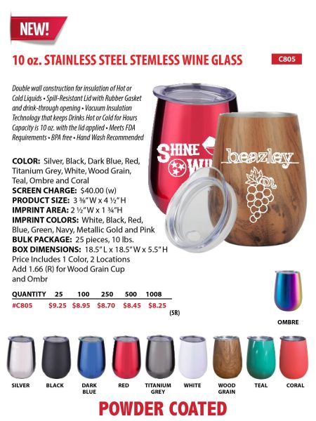 C805 10 OZ. STAINLESS STEEL STEMLESS WINE GLASS